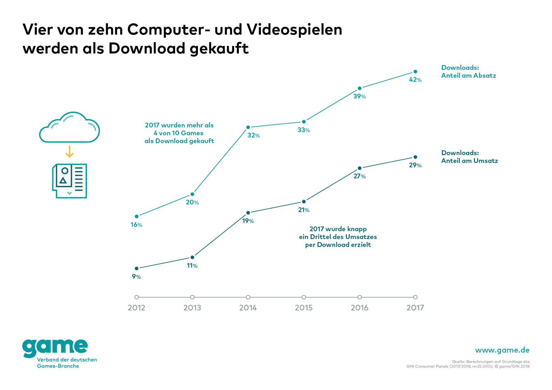 Der Branchenverband game hat jetzt neue Zahlen und Statistiken zum Thema Spieleverkauf in Deutschland veröffentlichht: Demnach wurden 2017 hierzulande 42% aller gekauften Spiele für PC, Konsolen und Handels per Download erworben – 3% mehr als im Vorjahr. Der Anteil am Gesamtumsatz stieg auf 29 % von zuvor 27%.