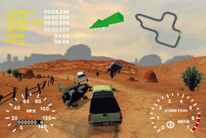 Während PS2-Besitzer bei Wild Wild Racing mit drahtigen Buggys durchs Gelände rasen, lässt es 4×4 Evolution auf dem Dreamcast gemächlicher angehen: Mit bulligen Off-Road-Trucks der Marken Chrysler, Nissan & Co. rauscht Ihr über 15 Kurse – von arktischen Pisten über Sandgebiete in Arizona bis zu matschigen Motocross-Strecken. Höchstgeschwindigkeiten schaffen die schweren Karren nicht gerade, aber das ist auch zweitrangig: Ebenen Asphalt findet Ihr sowieso selten, stattdessen sind der kräftige Allrad-Antrieb für unwegsame Steigungen und eine stabile Federung bei Sprüngen gefragt.