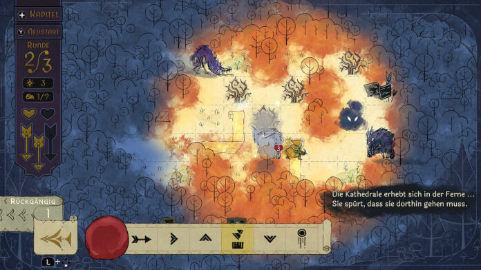 In einer Märchenwelt, in der Menschen durch ein Heulen in Wölfe verwandelt werden, schlüpft Ihr in die Rolle eines tauben Gelbkäppchens. Jedes Level besteht aus einer bildschirmfüllenden Schachbrett-Arena mit einigen Hindernissen, ein paar Bestien-Gegnern und meist einem Zielpunkt. Pro Runde habt Ihr bis zu sechs Aktionen, die Ihr in Ruhe planen dürft. Doch bei jedem Schritt, Pfeilschuss oder Schubser bewegen sich auch die Waldmonster auf Euch zu. Das ist anfangs noch simpel, später haben Feinde jedoch mehr Leben, attackieren Euch sofort bei Sichtkontakt oder werden erst aufgedeckt, wenn Ihr Euch ihnen gefährlich nähert. Meistert Ihr die kompakten Missionen in der vorgegebenen Rundenzahl oder erledigt Ihr genügend Gegner, schaltet Ihr über optionale Wege Spezialfähigkeiten wie eine Rauchbombe und Superjumps frei oder levelt diese auf. Aktiviert Ihr den hilfreichen Assistenzmodus, erleichtert dieser die Übersicht in der Planungsphase, weil Ihr die Reaktionen Eurer Gegner bereits vor der Ausführung angezeigt bekommt. Da die Waldbewohner klaren Regeln folgen, sind die Passagen auch ohne frustrierendes Trial & Error lösbar.