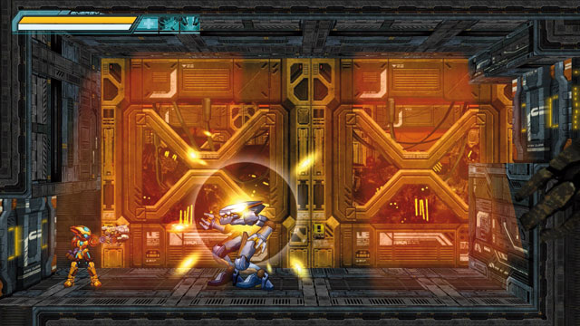 Trotz dieser Twinstick-Anleihe fühlt sich A.R.E.S. stark nach Mega Man X an, nicht zuletzt dank der Möglichkeit, an Wänden hinabzugleiten. Ihr klaut besiegten Bossen hier zwar keine Waffen, bekommt aber im Verlauf des Spiels immer wieder neue Wummen und Fähigkeiten, die eine flexiblere Vorgehensweise erlauben. Zudem ist es nützlich, im tobenden Bosskampf noch mal schnell die Lebensenergie auffrischen zu können. Solche Fähigkeiten benötigen allerdings Energie, die Ihr unterwegs sammelt geht sie zur Neige, ist auch Schluss mit Extras. Außerdem solltet Ihr die Levels gründlich durchforsten, manch ein Hilfsmittel ist nur abseits des eigentlichen Weges zu finden. Obwohl A.R.E.S. schon seit ein paar Jahren auf dem PC erhältlich ist, hat sich das Sci-Fi-Abenteuer grafisch sehr gut gehalten und die EX-Fassung geriet tatsächlich noch ein Stück hübscher als das seinerzeit schon ansehnliche Original auf dem Rechenknecht.