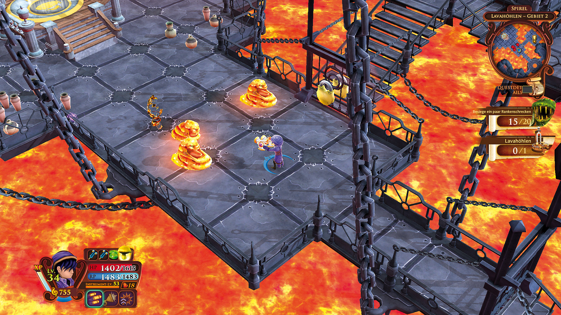 Dabei fängt AereA gut an. Ihr habt die Wahl zwischen vier Helden mit unterschiedlicher Bewaffnung. Nach und nach levelt Ihr auf und schaltet Spezialattacken frei, als Beute warten leider nur Geld und Heilitems, welche Ihr alternativ in einem Laden in Eurer Basis kauft, sobald Ihr die dazugehörigen Rezeptbücher gefunden habt. Doch in den Levels stellt sich schon nach wenigen Quests Langweile ein. Feinde, die sich gerne direkt neben Eurer Spielfigur materialisieren, sind nach ein paar Upgrades keine Bedrohung mehr. Selbst Bosse erledigt Ihr mit einer einzigen Attacke, wenn Ihr Eure Angriffsstärke etwas ausgebaut habt! Schnell seid Ihr nur noch genervt, weil Euch die Story immer wieder in bereits besuchte Gebiete schickt, welche aus verschlungenen Labyrinthen bestehen, in denen Ihr viele Laufwege auf Euch nehmen müsst, um Schalter zu drücken und Tore zu öffnen. Natürlich bei jedem Besuch erneut! Um den Überblick zu behalten, wo sich welches Törchen geöffnet hat, wäre eine Karte des gesamten Levels nett – die gibt es aber nicht. Also lauft Ihr Euch die Hacken wund, erledigt Feinde im Vorbeigehen, lest die krude Story um Ur-Instrumente und den Streit zweier Dirigenten und ärgert Euch, dass Euch zu viele da capos den eigentlich guten Orchester-Soundtrack madig machen.