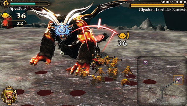 Bei den Spezialmanövern kommen auch allerlei Touch-Geschicklichkeitstests zum Einsatz: Ihr spielt beispielsweise Kriegshörner, um der Armee Mut zu machen. Strategisch gilt es, die Soldaten auf die verschiedenen Angreifer zu verteilen oder konzentrierte Angriffe zu starten, so dass Euer Heer insgesamt minimalen Schaden nimmt. Ihr müsst Euch die Figuren einteilen, nur selten ergattert Ihr Nachschub in Form von Särgen. Denn am Ende jeder Welt wartet ein teuflischer Obermotz, für den Ihr jeden Mann benötigt: Stellt Euch gehörnten Dämonen, Wurm- und Drachenwesen! Bei dem mitunter heftigen Gemetzel sterben Eure Untertanen 1000 Tode: Nur wer sie schnell wiederbelebt, hält die Streitmacht beisammen! Besiegte Gegner hinterlassen leckeres Fleisch, Heilherzen für Euren Anführer und allerlei Materialien, die Ihr mittels Alchemie in Waffen und Ausrüstung wandelt so lässt sich das Heer mit der Zeit ausbauen. Neben neuen Upgrades und unterschiedlichem Feindverhalten wird allerdings kaum Abwechslung geboten: Die Umgebung sorgt nur für optische Variationen, taktisch nutzbares Inventar gibt es kaum zu entdecken. Bis zu vier Freunde dürfen die Kräfte ihrer Armeen vereinigen. Splatterfans freuen sich über die brachiale Präsentation mit wuchtigen Animationen, reichlich Blut und einem zünftigen Heavy-Metal-Soundtrack.