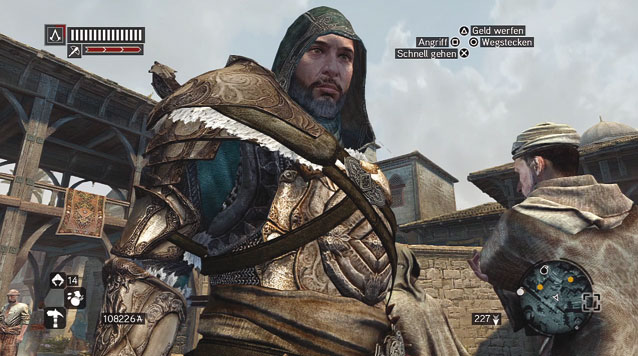 Schnell begeben wir uns von hier aus in Ezios Geschichte und lernen den Assassinen Yusuf kennen, der uns mit dem neuen Kletterhaken vertraut macht, mit dem wir schneller (und lauter) denn je an Wänden emporklettern, uns beim Flüchten elegant über den Rücken gegenüber stehender Personen abrollen oder an über den Dächern gespannten Leinen abseilen. Als weitere Novität baut Ihr in Revelations mannigfaltige Granaten und Sprengfallen, um Gegner abzulenken oder zu töten. Zutaten hierfür findet Ihr in Schatztruhen, bei toten Gegnern und Händlern, gebaut werden sie an großzügig verteilten Stationen, neben denen sich meist auch eine fürs Kommandieren der Assassinenschüler befindet. Wie im Vorgänger schickt Ihr Verbündete, die Ihr erst rekrutieren müsst, auf zeitbasierte, automatisch ablaufende Auslandseinsätze. So verdient Ihr Einfluss, Geld und Zutaten, gleichzeitig levelt Ihr die Kameraden auf, um sie als effizientere Killer per Knopfdruck im Kampf gegen die byzantinische Janitscharengarde als Unterstützung zu rufen. Erstmals trainiert Ihr die Verbündeten in eigenen Missionen und setzt diese als Anführer eines Eurer Lager ein. Was im Vorgänger die Borgia-Türme, das sind in Revelations die Festen. Habt Ihr den Anführer eines Templer-Lagers erledigt was einfacher ist als in Brotherhood , gehört Euch das Viertel so lange, bis die Templer zum Gegenangriff blasen. Dann verteidigt Ihr Euer Gebiet in einem schlecht balancierten Tower-Defense-Minispiel, das nach dem ersten Mal langweilt. Damit Eure Feinde angreifen, müsst Ihr in Verruf geraten das passiert durch Kämpfe auf offener Straße ebenso wie durch das Unterstützen des örtlichen Handwerks. In eroberten Vierteln investiert Ihr Geld in Schmieden, Apotheken, Buchhandlungen und Schneidereien, um Euer Gewand zu färben, Schatzkarten, Medizin sowie stärkere Waffen und Rüstzeug zu kaufen. Ebenfalls wieder dabei: Huren-, Diebes- und Söldner-Zünfte freischalten, um in den Straßen taktische Verbündete vorzufinden.