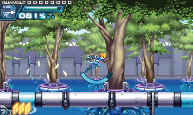 Da Capcom an Mega Man wohl kein Interesse mehr hat, schicken sich andere an, diese Lücke zu füllen. Weil Keiji Inafunes Mighty No. 9 weiter auf sich warten lässt, wittert nun Inti Creates, das Studio hinter den exzellenten Download-Abenteuern Mega Man 9 und Mega Man 10 seine Chance. Mit seiner blauen Kleidung erinnert Held Gunvolt tatsächlich auf den ersten Blick an Mega Man, die blonde Haarpracht dagegen gemahnt eher an den Kollegen Zero.Ähnlich wie in deren Abenteuer entscheidet Ihr Euch nach einem kurzen Einstiegslevel, welche der thematisch unterschiedlichen Stages Ihr als Nächstes in Angriff nehmen und welchen Boss Ihr dann zerlegen wollt. Doch spielerisch geht Gunvolt interessante eigene Wege: Der normale Schuss ist wenig durchschlagskräftig und dient eher dazu, Gegner zu markieren, um ihnen dann mit einer elektrischen Entladung den Rest zu geben. Die Elektrizität ist das zentrale Element: Wenn Ihr Gunvolts Kraftfelder und Blitze beherrscht, schützen Euch die originellen Fähigkeiten nicht nur vor gegnerischem Dauerfeuer sie richten beim Gegner auch gleich massiven Schaden an oder werden genutzt, um kleine Kisten zu öffnen und Barrieren aus dem Weg zu räumen. Während Ihr nach Herzenslust herumballern dürft, gilt es bei der Blitzerei aufzupassen, dass Ihr nicht überhitzt oder Euch entladet dann ist eine kurze Pause nötig, um wieder zu Kräften zu kommen. Zwischen den Levels verfolgt Ihr die Story um eine geheimnisvolle Muse, einen Konzern mit Weltherrschaftsambitionen und eine zu allem entschlossene Widerstandszelle.