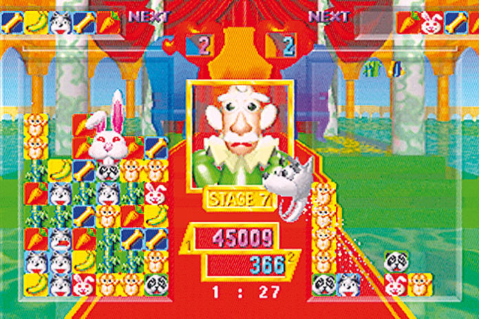 In dem bunten Columns-Clone füttert Ihr Euch von den Mitbewerbern bis zum Hofstaat empor. Nach bewährtem Stapelprinzip ordnet Ihr herunterfallende Würfel in vier verschiedenen Farben. Jedes Quadrat ist zusätzlich mit einem Tier- oder Fruchtsymbol gekennzeichnet. Liegen z.B. Affe und Banane nebeneinander, beginnt ein Festtagsschmaus, der auch anliegende Bananen mit einschließt. Rutschen höher liegende Quadrate nach, entstehen ellenlange Kettenreaktionen, die der Feind in Form von Strafsteinen büßen muß. Den Rest kennt Ihr: Stapeln sich Eure Türme zu hoch, habt Ihr verloren.