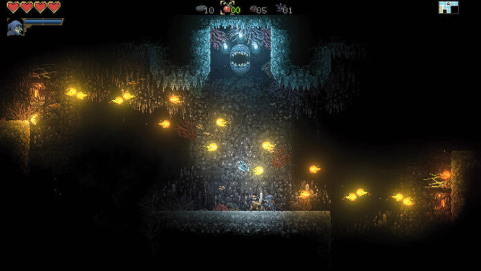 Vermaledeit! Kaum habt Ihr Euch für einen männlichen oder weiblichen Barbar entschieden, schon befindet Ihr Euch im Sturzflug und landet in einem ziemlich düsteren Höhlenlabyrinth. Ihr habt zwar leider keine Streichhölzer in Euren Fellshorts, aber glücklicherweise begleitet Euch Euer magischer Fledermausfreund Pip, der mit seiner Lichtaura für ein wenig Übersicht sorgt. Eure Aufgabe ist es nun, den Ausgang zu finden. Das ist nicht so einfach, denn die Höhlen sind verwinkelt und manch potenzieller Weg bleibt Euch Metroidvania-typisch vorerst versperrt, bis Ihr oder Euer geflügelter Anhang eine neue Fähigkeit erlernt habt. Das Kampfsystem ist simpel. Ihr schlagt mit einer Taste zu, mit dem Analogstick werft Ihr Beeren, denen der gefräßige Pip folgt.