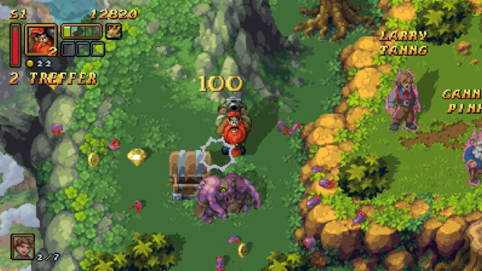 Battle Axe ist dem Fantasy-Lager zuzurechnen und weckt unverkennbar Erinnerungen an Spiele wie Gauntlet und ­Golden Axe. Alleine oder zu zweit zieht Ihr aus Schräg-oben-Ansicht durch hübsche Pixel-Wälder und -Dungeons: Anstürmende Gegner werden mit Nahkampf, Projektil oder Spezialattacke erledigt (die drei wählbaren Charaktere spielen sich dabei relativ ähnlich), auf dem Weg zum jeweiligen ­Levelboss befreit Ihr Geiseln oder sammelt Extras wie Energie­auffrischung oder Bomben auf.