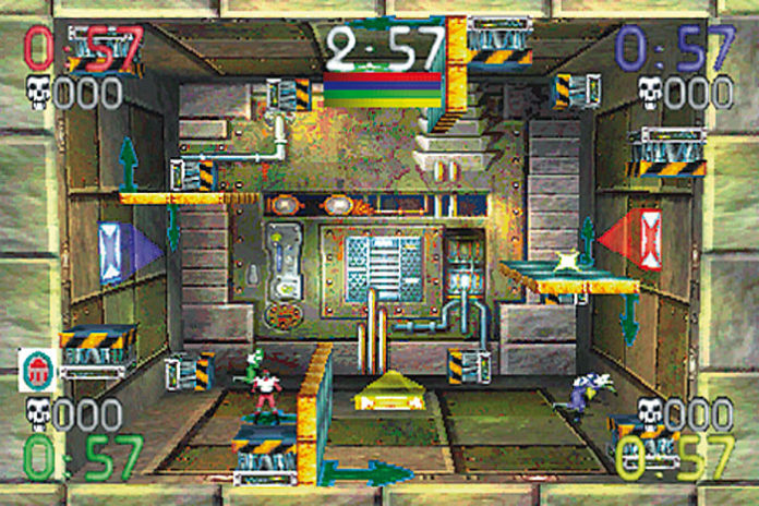 Schlechte Nachricht: Stellt Euch vor, Ihr habt eine kiloschwere C4-Plastiksprengstoff-Bombe auf dem Rücken, deren Timer unerbittlich abläuft. Nur wenn ihr einen Kristall schnappt und in Euren farblich passenden Reaktor legt, verlängert sich die Zeit bis zur Detonation um 30 Sekunden. Die zweite schlechte Nachricht: Drei arme Kerle mit demselben Ziel treten zugleich gegen Euch an und schubsen Euch gnadenlos zur Seite, nur einer von Euch wird die Blast Chamber wieder lebend verlassen. Das besondere an den Schauplätzen des Kristall-Gerangels auf Leben und Tod: Tritt einer der Kontrahenten auf einen grünen Pfeil, rotiert die Kammer um 90 Grad, und alle anderen Spieler und der Kristall purzeln auf die neue Bodenfläche: der Kampf beginnt von neuem. Um aufgestaute Haßgefühle zu kompensieren, könnt Ihr den Kristall auch in die gegnerischen Reaktoren bringen: Den Feinden zieht’s dabei wenige Sekunden Lebens-Zeit ab.