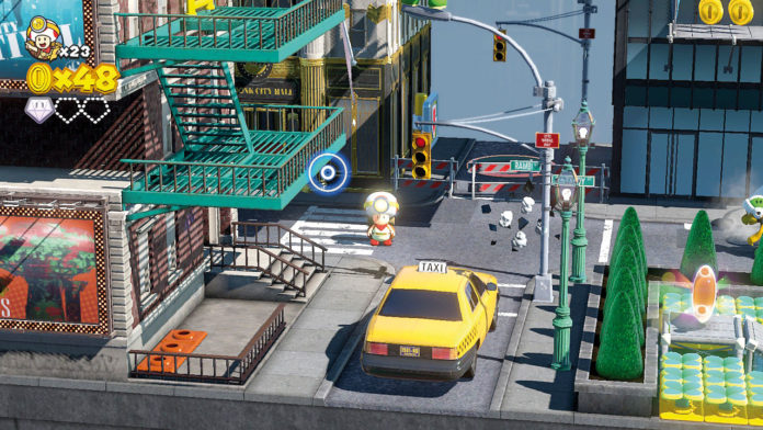 In Treasure Tracker lenkt Ihr den mittelmäßig mutigen Abenteurer (und in späteren Kapiteln auch sein Zöpfe tragendes Pendant) durch hübsch gestaltete Level-Dioramen. Ständig dreht Ihr die Kamera, um Eure Figur im Blick zu behalten, neue Wege zu entdecken oder Feinde zu erspähen. Toad(ette) kann nicht hüpfen – und demzufolge auch keinem auf den Kopf hüpfen. Also nehmt Ihr lieber die Beine in die Hand, wenn Gumbas, Shy Guys, Footballspieler oder lichtscheue Schlammschlurfer auf Euch zusteuern. In jeder Stage müsst Ihr den Zielstern finden, nebenbei könnt Ihr Diamanten suchen, Zusatzbedingungen erfüllen oder die schnellste Zeit jagen. Um all das zu schaffen, müsst Ihr Levelbausteine drehen, Brücken aktivieren, durch Röhren rutschen oder Geheimtüren finden – wieder und wieder entdeckt Ihr kluge Designkniffe und Abkürzungen, die Euch ein Lächeln aufs Gesicht zaubern.