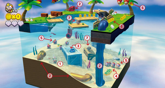 Ein typisches Level von Captain Toad: Treasure Tracker geht so (siehe oben): Ihr dirigiert den Pilzkopf (1, hier unter Wasser mit Schwimmbrille) durch dioramaähnliche, meist viereckige Mini-Levels. Captain Toad kann durch Röhren flutschen (2) und muss Schalter aktivieren (3). Er kann Rüben (4) aus dem Boden rupfen und sie auf Feinde (5) schleudern. Manch fliegender Gegner stürzt sich aus der Luft (6) auf ihn. In jeder Stage sind drei Kristalle versteckt (7, im Bild sind zwei sichtbar), und natürlich freut sich der Captain über goldene Münzen (8) wenn Ihr 100 erbeutet, winkt ein Zusatzleben. Ziel jedes Levels ist ein goldener Stern der ist manchmal sofort sicht-, aber nicht erreichbar oder er versteckt sich vor Euren Blicken, wie in unserem Beispielbild.