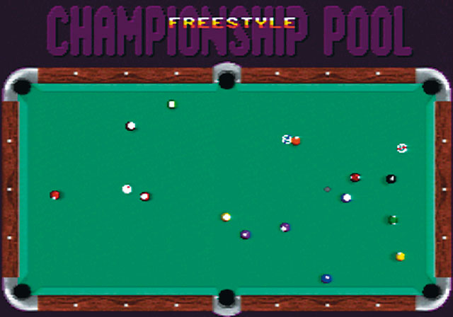 Die Weihnachtsoffensive von Mindscape (beinahe ein halbes Dutzend Neuveröffentlichungen fürs Super Nintendo) schließt auch die erste offizielle Billard-Simulation ein. Anders als bei Side Pocket fürs Mega Drive läßt Euch Championship Pool beinahe jede geschichtlich überlieferte Pool-Variante wählen – Ihr dürft sogar Eure eigenen Regeln aufstellen. Neben der Standard-Optik, die Euch das obige Bild zeigt, könnt Ihr den Billardtisch vergrößern oder aus einem anderen Winkel betrachten. Das Queue bleibt Euch allerdings vorenthalten. Auf dem Bildschirm seht Ihr nur eine huschende Kugel-Imitation, die Schlagrichtung und Abprallwinkel des Spielballes angibt. Um Spin und Schlagstärke zu wählen, wird auf Untermenüs umgeblendet.