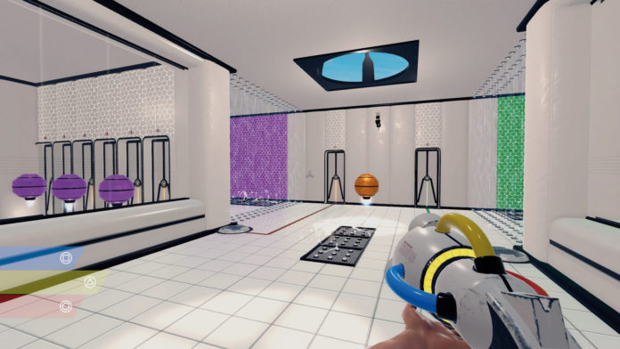 Während Switch-Besitzer gegenwärtig fröhlich in Splatoon-Action-Duellen mit Farbe um sich spritzen, kommen ChromaGun-Spieler ins bunte Grübeln: Zwar habt Ihr auch hier eine fiktive Wumme in der Hand, mit der sich Umgebung und Gegenstände kolorieren lassen. Aber hier geht es darum, zunehmend kniffliger werdende Rätsel zu lösen. Ihr seid aus der Ego-Ansicht in einem sterilen Labor unterwegs und habt immer die gleiche Aufgabe: Erreicht die Ausgangstür. Allerdings ist die meist versperrt und muss erst durch das Aktivieren von Bodenschaltern geöffnet werden. Dafür wiederum benötigt Ihr in der Regel mehr oder weniger freundliche Kugeldroiden: Diese Gesellen werden wie magisch angezogen von Wandfeldern, die in der gleichen Farbe erstrahlen wie sie selbst – mit der titelgebenden Waffe dirigiert Ihr sie so indirekt herum. Das hört sich simpel an und ist anfangs auch leicht zu lösen, wird aber laufend komplizierter. So müsst Ihr Eure drei Grundfarben (Rot, Gelb, Blau) bald auf Basis der Farblehre mischen (Gelb und Blau ergeben etwa Grün), einige Wände lassen sich nicht färben oder werden nach kurzer Zeit wieder neutral. Einige Droiden sind mit Stacheln ausgestattet und verfolgen Euch, sobald sie aufmerksam werden, und nicht zuletzt tauchen elektrifizierte Bodenplatten auf, bei denen Kontakt sofort tödlich endet. Trotzdem sind fast alle der rund 50 Abschnitte in Ruhe zu lösen, nur selten kommt es auf schnelles Agieren an. Das ist auch gut so, denn meist reicht eine falsch gefärbte Wand und Ihr müsst den unschaffbar gewordenen Abschnitt neu starten.