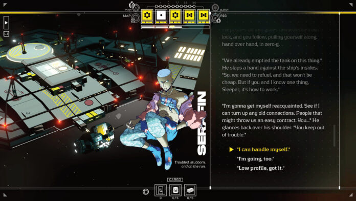 Vorkenntnisse braucht Ihr dabei keine, um Citizen Sleeper 2 zu spielen. Die Geschichte ist komplett eigenständig, Veteranen treffen nur hier und da auf bekannte Gesichter. Für Einsteiger werden alle Mechaniken erneut im Detail erklärt. Eine Auffrischung tut aber allen gut, auch weil ein paar Neuerungen zu finden sind: Die Wahl der eigenen Charakterklasse hat Einfluss, wie Ihr für welche anstehenden Aktionen geeignet seid, wenn Ihr in jedem Zyklus durch den Einsatz von maximal fünf Würfeln auf erfolgreiche Ergebnisse bei ebenso vielen Tätigkeiten hofft. Klappt das nicht, steigt nun Euer Stresslevel, was wiederum zu ”Glitches” (erhöhte Fehlerchance beim Wurf) führen kann, wenn Ihr Euch nicht erholt. Ansonsten ist der größte Unterschied, dass Ihr diesmal auf der Flucht vor einer nahenden Gefahr seid und deshalb mit einem Raumschiff zu verschiedenen Orten reist, um sie abzuhängen. Dazu kommt, dass Ihr Crewmitglieder anheuert und risikoreichere, aber auch lohnenswertere Jobs annehmen könnt.