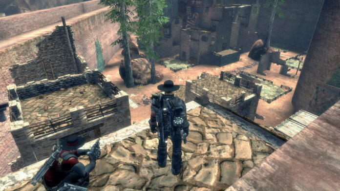 In Damnation hat der ’amerikanische Western’ nie aufgehört zu existieren, nach dem Bürgerkrieg übernimmt ein Großindustrieller die Macht über das zerrüttetete Land. Als Widerstandskämpfer steckt Ihr den Techno-Colt in den Pistolengurt und zieht los, um den Schurken zu neutralisieren. Dazu schlagt Ihr Euch in Third-Person-Sicht durch mehrere weiträumige Szena­rien, die vor allem zwei Dinge beinhalten: regelmäßig auftauchende Gegnergrüppchen und langwierige Kletterpassagen. Die Bösewichte nehmt Ihr per Schultertaste genauer ins Visier und ärgert Euch darüber, dass Eure Waffen nicht gerade treffsicher sind. Zum Glück haben Eure ständigen Begleiter mehr Zielwasser getrunken und nehmen Euch Ärger ab. Ohne sie wärt Ihr bei der Erforschung aufgeschmissen, denn die selten geradlinigen Wege lassen sich kaum erahnen und eine Karte gibt es nicht – wie gut, dass Eure Kumpane sich immer da materialisieren, wo Ihr entlang müsst.