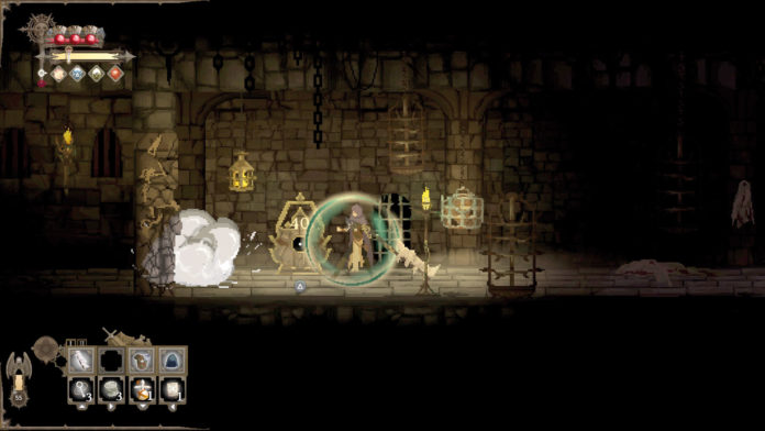 Als Mitglied der Templer erforscht Ihr vier große und verschachtelte Pixel-Areale. Zu Beginn (und nach jedem Tod) stellt Ihr Euch beim Schmied im Hub zwei Waffensets zusammen, die etwa Schwerter, Schilde, Bögen, Zweihänder, Items und Rüstungen enthalten. Danach geht es in die nicht prozedural erstellten Levels und darin Raum für Raum voran – durchschreitet Ihr ein Tor, gibt es kein Zurück.