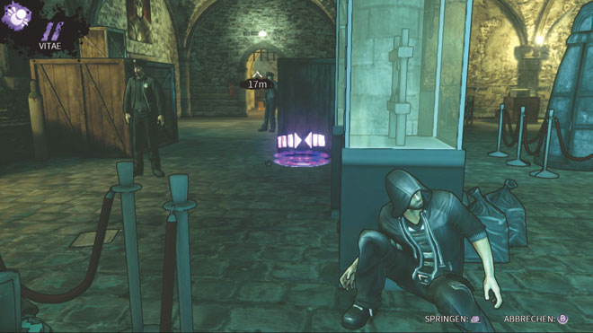 Das komplette Abenteuer ist aufs Schleichen ausgelegt, es gibt weder Waffen noch Items: Die Handlung führt Euch durch allerlei mehrstöckige Räume und verzweigte Gänge, in denen Wächter nach dem Rechten sehen. Manche folgen den immer selben Laufpfaden, andere stehen einfach nur in der Landschaft herum je nach Schwierigkeitsgrad variieren ihre Sicht- und Hörweite. Ihr pirscht im günstigen Augenblick von Deckung zu Deckung, schaltet die Gegner mit Nahkampfmanövern aus oder sorgt für Ablenkung: Mit verschiedenen Tricks lassen sich die Wachen von ihren Posten locken, dazu nutzt Ihr lärmiges Levelinventar (z.B. Scherben am Boden) oder Euer Manipulationstalent. Solche Vampirkräfte benötigen einen Schluck Blut Erics Schlürfen alarmiert jedoch nahe Zeugen. Insgesamt kauft und verbessert Ihr 16 Vampirkräfte, darunter Teleporterangriff, Unsichtbarkeit, Sinnestäuschungen und Röntgenblick damit seid Ihr selbst vielköpfigen Sicherheitsmannschaften haushoch überlegen! Etwas verzwickt ist die Mechanik mancher Manöver, z.B. lässt sich der Zeiger für den Teleport oft nur umständlich an die gewünschte Stelle lenken.