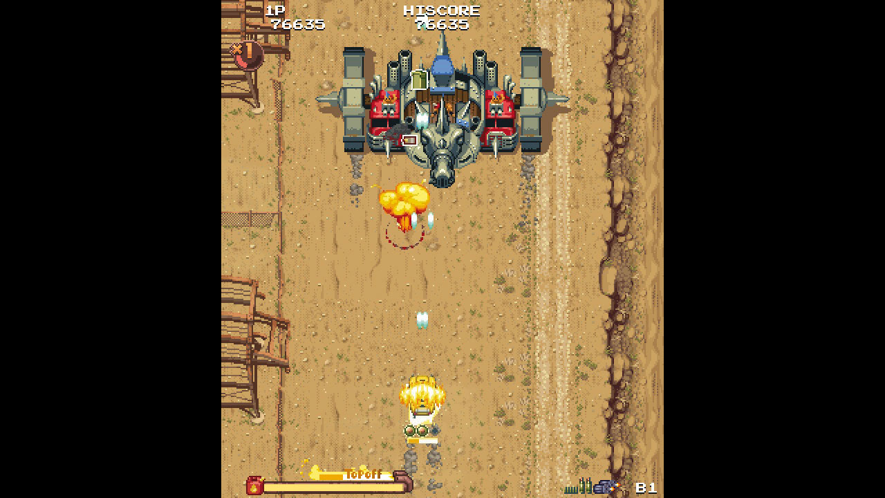 Die Aufmachung im wuchtigen Neo-Geo-Look verspricht einiges für das Vertikal-Shoot’em-Up mit postapokalyptischem ”Mad Max”-Setting. Ihr ballert Euch mit Eurem aufgemotzten, schwer bewaffneten Vehikel sowohl durch Sequenzen im Galaga-Stil als auch Passagen mit Hindernissen. Am Ende jeder Stage wird ein dicker Boss zerlegt.
