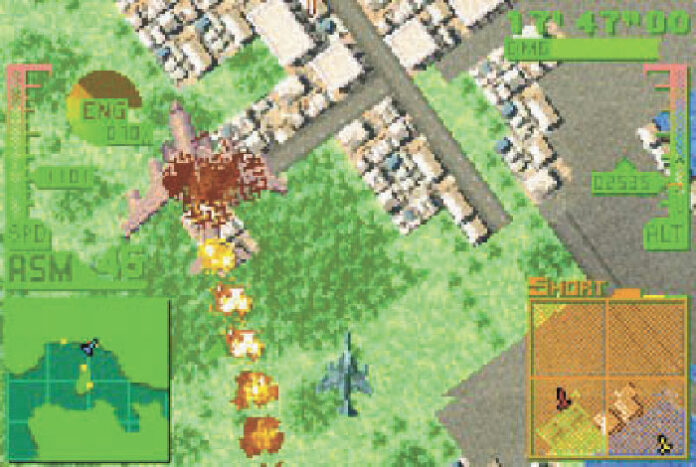 Ging’s im gleichnamigen Xbox-Action-Flugi aus traditioneller Cockpitperspektive zur Sache, ließ sich Konami beim GBA-Ableger etwas Neues einfallen. Hier steuert Ihr diverse Kampfjets aus der Vogelansicht, wobei Ihr jedoch keine festgelegten Routen entlang trudelt, sondern die die Mode-7-artigen Bodenkulissen frei abfliegt.
