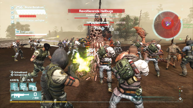Nach der Notlandung nahe San Francisco erkundet Ihr die Welt mit dem Quad: Ihr brettert durch Gebirge, Farmland, Ruinen und allerlei futuristische Botaniken, welche sich im Laufe des Terraformings entwickelt haben. Es gibt auch diverse Sehenswürdigkeiten wie die Golden Gate Bridge und das San-Quentin-Gefängnis zu bestaunen sowie Schnelltransportstationen zu entdecken. Hier sammeln sich die Spieler, weil im Umfeld Automaten (Ausrüstung und Fahrzeuge) installiert sind. Da wird experimentiert, gehandelt und geplaudert. Im Mittelpunkt stehen jedoch die vielen Waffen, mit denen Ihr den KI-gesteuerten Aliens, Soldaten und Endzeitgangs einheizt: Ähnlich zu Borderlands findet und kauft Ihr zahlreiche Varianten mit Elementschaden. Neben Feuerflinte, Biogewehr und Elektroschockpistole gibts auch ausgefallene Effekte. Ihr dürft z.B. die Lebensenergie der Gegner absorbieren oder ihnen Parasiten injizieren, die aus ihren Leichen krabbeln und weitere Feinde anknabbern. Obendrein hantiert Ihr mit vielerlei Spezialgeschossen und Feuermodi, darunter Haftgranatenwerfer mit Fernzünder und Schrotflinten mit Salvenfeuer. Des Weiteren lassen sich die Waffen mit bis zu vier Modifikationen erweitern: Wer im Optionsmenü die Schadensanzeige aktiviert, kann aus seinem Arsenal das Optimum herausholen je nach Gegnertyp unterscheidet sich die Effizienz. Obwohl sich mehrere hundert Spieler in der Sci-Fi-Welt tummeln, zieht Ihr meist alleine los und hofft auf zufällige Gesellschaft: Die Gruppenfunktion erlaubt zwar verbrüderte XP-Jagd, gemeinsame Quests klappen aber nur bei ähnlichem Spielstand: Wenn ein Spieler die Gruppenquest noch nicht aktiviert oder aber bereits gespielt hat, kann er nur mitlaufen und auf die erscheinenden Gegner ballern Questgegenstände und -szenen sowie Abschlussprämien erscheinen bei ihm nicht! Zudem ist im Gruppenmodus häufige Absprache per Headset erforderlich, weil Zielmarkierungen des Gruppenführers nicht auf die HUDs der Kollegen projiziert werden.