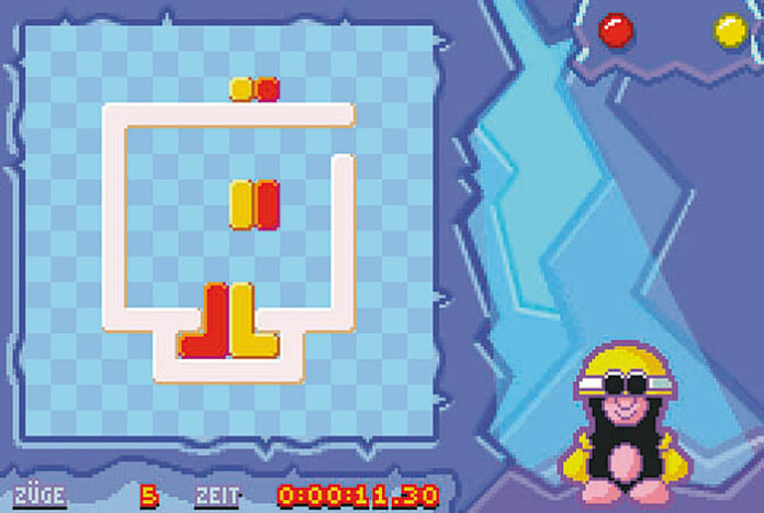 Knuffig Knobeln auf dem GBA: Bei Denki Blocks müsst Ihr einzelne Blöcke so auf einem Spielfeld herumschieben, dass sie aneinander kleben. Schwierig wird das durch Hindernisse und die Tatsache, dass Ihr immer nur alle Quadrate auf einmal gleichzeitig bewegen könnt.