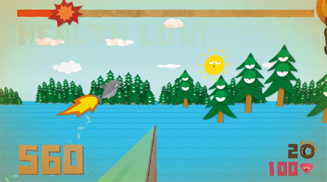 Hai Derrick ist auf Rache aus: Weil die blöden Menschen seine Eltern zu Dosenfutter verarbeitet haben, sagt er ihnen den Kampf an und mampft sich entschlossen durch die Ozeane der Welt. Dabei muss er schnell sein: Derrick ist ständig hungrig und muss Meerestiere oder Menschen fressen, um nicht zu verhungern wie bei Wonder Boy leert sich die Energieleiste sonst permanent. Für Abwechslung sorgen Renn-Levels und Bosskämpfe. Derrick the Deathfin spielt sich schnell und flüssig, aber die 32 Levels habt Ihr bald alle gesehen. Dafür ist der Grafikstil brillant: Die Welt und ihre Bewohner wurden im Papercraft-Stil gestaltet, das sieht einfach toll aus und sorgt für ganz eigenes Flair. Auch ohne Online-Leaderboards ists ein idealer Hai-Happen für zwischendurch.