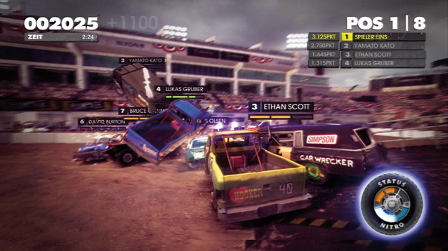 Das Kernstück von DiRT Showdown bilden die Crash-Events, in denen Ihr entweder in sich kreuzenden Kursen einen kühlen Kopf behalten, möglichst lange fahrtüchtig bleiben oder Eure Gegner zu Altmetall verarbeiten müsst. Im Preview letzten Monat mäkelten wir, dass es den Zusammenstößen noch an Wucht fehle. Dieser Eindruck bestätigte sich in der Testversion. Eure Karossen werden zwar hübsch verbeult und lassen nach und nach Kühlergrill, Motorhaube und Kotflügel fallen, richtig viel Action kommt aber trotzdem nicht auf. Stressig wird es dagegen schon, denn oft versaut Euch ein Rempler im falschen Moment den Sieg, da die Konkurrenz Euch gerne mal auf die Hörner nimmt. Das serientypische Rückspulfeature hilft dabei nur selten, da es nur in wenigen Rennen vorhanden ist. Durch einen starken Gummiband-Effekt ist Euch das Fahrerfeld aber nie weit voraus, selbst wenn Ihr Euch an einer Ecke verhakt und erst umständlich rangieren müsst. Das kommt vor, da sich die meisten Sportwagen, Pick-ups und Buggys etwas schwerfällig steuern. Trotzdem kann man sich nicht des Eindrucks erwehren, dass bei Rampage, Hard Target und Knock Out eher Glück als Können entscheidet.