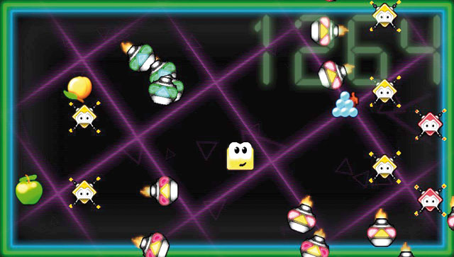 Weicht Feinden aus und sprengt sie mit Obstbomben seltsam, aber spaßig.