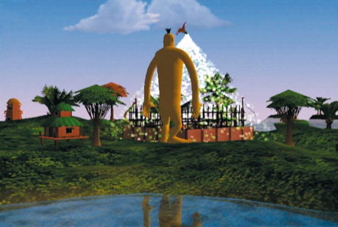 Dereinst entstieg ein Riese dem Meer: Gelb, schlaksig, freundlich grinsend – in seiner Gummi-artigen Texturlosigkeit aussehend wie ein abgemagertes Michelin-Männchen mit Hepatitis. Der Riese betrat eines frühen Morgens ein Inselreich, das von vier Menschenpärchen bewohnt wurde, die sich alleine in ihrer Hemdfarbe unterschieden. Allen gemein war dagegen ihr Respekt vor dem gelben Giganten – und ihr Anspruchsdenken: ‘Bring’ uns einen Baum, auf dass grüne Lebensenergie fließe!’, ‘Ebne durch Deine magischen Kräfte den Boden, damit wir hier unser Häuschen bauen können und ein Bananenbeet!’ oder ‘Stell den dummen Baum woanders hin!’. Der Riese tat wie ihm befohlen und für seinen Einsatz erntete er die Liebe der Menschen in Herzenform. Hatte er rund zwei Dutzend davon gesammelt, wuchs der gelbe Gönner ein kleines Stück gen Himmel.