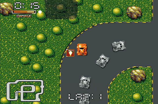 Als Segas 3-D-Autorennen Turbo 1981 in den Spielhallen für Begeisterungsstürme sorgte und das Wort “Polygon” von kaum einem Programmierer buchstabiert werden konnte, war die Zeit der Rennspiele aus der Vogelperspektive. Zubehör-Lieferant Ascii erinnert sich der frühen achtziger Jahre und stellt mit Double Clutch eine Hommage an die erste Generation von Fahrsimulationen vor. Ein bis zwei Spieler besteigen einen kleinen Flitzer und wagen den Start gegen ein halbes Dutzend Computerpiloten. Nach Wahl des Fahrers wird die Flagge gehißt: Auf dem Rundkurs (Scrolling in alle Richtungen inklusive) gelten keine Verkehrsregeln, allein die Plazierung zählt. Unterwegs lungern ein paar Bonusgegenstände, nach dem Ende des Rennens wird mit dem Preisgeld Autozubehör gekauft. Hofft aber nicht auf Waffenextras (seit R.C. Pro-Am auf dem NES sehr beliebt), lediglich spießige Standard-Utensilien wie Motor- und Bremsen-Updates sind im Angebot. Entsprechend gestärkt geht Ihr ins nächste von zwölf Rennen.