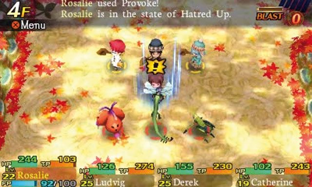 Entwickler Spike Chunsoft geht dabei überaus clever vor: Von Mystery Dungeon werden Spielkonzept und Regelwerk übernommen, Etrian Odyssey steuert Ästhetik, Kampfansatz und Skill-System bei. Ihr erkundet die Dungeons rundenbasiert aus der Vogelperspektive, Gegner laufen sichtbar herum, einen separaten Kampfbildschirm gibt es nicht. In den stets neu generierten Labyrinthen seid Ihr im Gegensatz zu anderen Roguelikes nicht alleine unterwegs: Ihr habt drei weitere Figuren im Schlepptau, die selbstständig Feinde angreifen und vorschlagen, verletzte Gruppenmitglieder zu heilen, aber auch direkt gesteuert werden können. Das macht vor allem die knackigen Bosskämpfe spielerisch ziemlich interessant und fordernd. Dabei ist der erste Eindruck ernüchternd: Bis zum ersten Obermotz ist ein Schwierigkeitsgrad kaum zu bemerken. Zum Glück kriegt das Spiel dann aber souverän die Kurve – spätestens wenn die extrem mächtigen DOE-Gegner ins Spiel kommen, wird es richtig interessant. Die DOEs bewegen sich selbstständig durch den Dungeon und nehmen Kurs auf die Stadt Aslarga. Kommen sie dort an, machen sie wichtige Einrichtungen für eine Zeit unbrauchbar. Um sie zu stoppen, errichtet Ihr Forts und besetzt diese mit Leuten aus Eurer Party. Ein Fort bringt nicht nur wertvolle Buffs im Kampf gegen DOEs, es setzt auch das Layout eines Dungeons fest und gibt Euch so mehr Kontrolle über die Spielwelt.