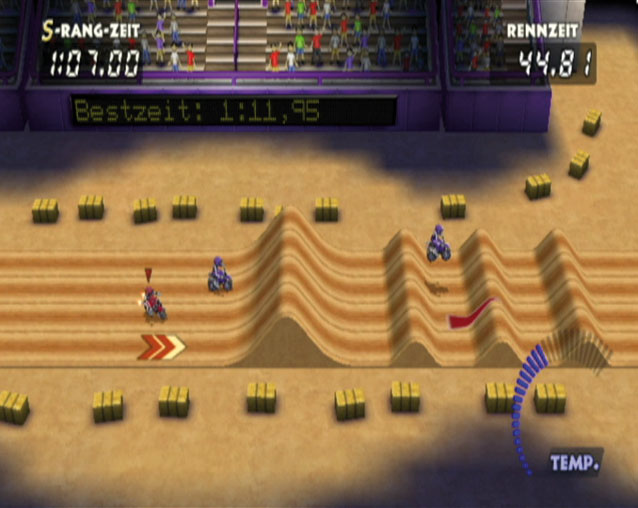 Die letzten drei Excite-Spiele hatten mit dem NES-Debüt von 1984 wenig gemeinsam: Statt Euch über knifflige Hindernisparcours zu schicken, ging es entweder zu 3D-Motocrossrennen auf dem N64 (Excitebike 64) oder in halsbrecherisch flotte Arcade-Querfeldeinrasereien (Excite Truck und Excitebots für Wii Letzteres schaffte es nicht nach Europa). Für den WiiWare-Abstecher World Challenge besann sich Nintendo wieder auf den Klassiker und beauftragte die Entwickler Monster Games damit, den Oldie möglichst authentisch aufzupolieren. Entsprechend macht Ihr das Gleiche wie damals auf dem NES: Ihr flitzt mit einem kleinen Biker über eine gerade Piste, die mit mehr oder weniger steilen Hügeln gespickt ist. Wechselt zwischen vier Fahrspuren, um Hindernissen wie Grasflecken oder Hürden auszuweichen. Andere Fahrer sind ebenfalls unterwegs, Euer Hauptkonkurrent ist aber die Zeit. Um die Rekordmarken zu überbieten, müsst Ihr die Sprünge klug anfahren: Reine Tempobolzerei bringt nichts, geschicktes Dosieren des Antriebs oder des Turboeinsatzes sowie saubere Landungen sind Trumpf. Die flotte Grafik fängt den Charme der Pixelvorlage gelungen ein, ohne zu altbacken zu wirken. Die 16 Pisten fallen durch intelligentes Design und verschiedene Umgebungen abwechslungsreich aus, die zweite Hälfte davon ist äußerst fordernd. Kreative Spieler basteln sich zudem im Editor eigene Kurse. Mehrspieler-Rennen gehen leider nur online, ansonsten gibt es an World Challenge kaum etwas zu meckern.