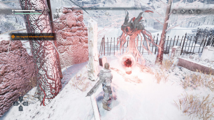 Noch während ich mich auf den Weg zurück in den Unterschlupf am Rande der Höhle mache, in dem Töchterchen Alice bereits wartet, meldet sich die Ausdaueranzeige – suche ich jetzt nicht schnell Schutz, dann sinkt automatisch auch mein spärlicher Lebensbalken. Mit einem mulmigen Gefühl im Bauch beschleunige ich meine Schritte, haste auf die rettenden Ruinen zu – und habe doch die Rechnung ohne den Schneesturm gemacht, der mir tosend die Orientierung raubt. Bevor ich mir eine neue Strategie zurechtlegen kann, ist er auch schon wieder da, mein Dämon mit der rauchigen Stimme, und haucht mir nach einem wenig ruhmreichen Tod in der eingangs erwähnten Höhle neues Leben ein. Ich habe nicht mehr viele Versuche, um dem Permadeath zu entgehen – also crafte, kämpfe und erkunde ich weiter, ein wenig vorsichtiger und mit meinem Dämon im kalten Nacken…