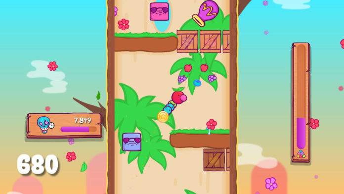 Als knollennasiger Frucht-Papa müsst Ihr Eure entführten Kinder wieder einsammeln, indem Ihr vertikale Schlauchlevels nach oben hüpft. Allerdings steuert Ihr den knuffigen Helden dabei nicht direkt, sondern legt seine Sprungkurve mit dem Analogstick fest, bevor er auf Knopfdruck abhebt – in der Luft lässt sich sein Drift nur geringfügig beeinflussen. Dieses Katapult-Prinzip sorgt für ganz eigene Herausforderungen, denn bewegliche Gegner müssen ebenso einkalkuliert werden wie Abprallwinkel, wenn Euer Obst Wände oder Hindernisse touchiert – ein bisschen fühlt sich das an wie ein Flipper.