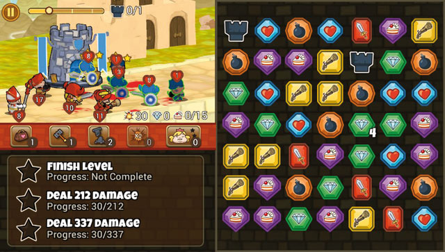 Die mobilen Free-to-Play-Zwänge merkt man allzu deutlich. Eigentlich steckt in Fat Princess: Piece of Cake nämlich eine gewitzte Match-3-Variante, die neben launig-bunter Optik mit einigen dezenten Taktik-Kniffen aufwarten kann: Die Juwelen stehen für verschiedene Truppentypen, je nach Schlachtsituation solltet Ihr bestimmte Arten bevorzugt zusammenbringen. Das macht Spaß, bis Ihr (schnell) an Grenzen stoßt: Dass Ihr nur begrenzt viel Versuche habt, die sich dann langsam wieder aufladen (oder sofort gegen Bares, für absurde 20 Euro ist die Mechanik abschaltbar), ist schon nicht erfreulich. Unabhängig davon steigen aber auch die Auflevel-Anforderungen der Truppen so sehr, dass langwieriges Grinding fällig wird.