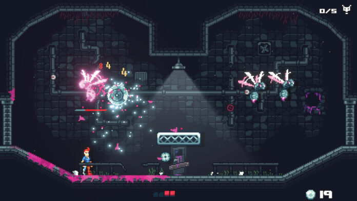 Von denen können zwei gleichzeitig aktiv sein und es gibt unterschiedliche Modelle: So verursachen Sägebälle wenig, dafür aber kontinuierlichen Schaden, während Bombenbälle richtig wehtun und auch mal explodieren. Dazu kommen Bonuseigenschaften, die Ihr in diverse Slots einsetzt. So ist der Erfolg in einem Lauf nicht nur von Eurer Geschicklichkeit, sondern auch kluger Extra-Auswahl und – ganz Rogue-typisch – einer kleinen Portion Glück abhängig. Auf einer Karte entscheidet Ihr Euch, welche Herausforderung Ihr als Nächstes angeht. Neben normalen Räumen mit Gegnern gibt es Shops für weitere Extras und Bonusräume, in denen Ihr Euch Geld und andere Ressourcen erschießt: Rüstet Euch gut für die Bosskämpfe! Geht dabei die Lebensenergie aus, fangt Ihr natürlich wieder von vorne an.