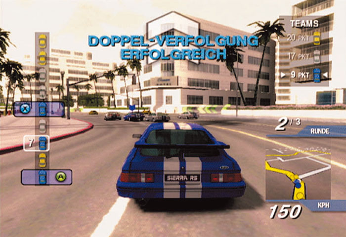 Ihr flitzt wie gehabt in verschiedenen Ford-Modellen um den Kurs, müsst aber nicht alleine den ersten Platz ergattern, sondern im Verbund mit einem oder zwei Kollegen die meisten Punkte einfahren. Dazu lenkt Ihr nicht nur Euer Vehikel, sondern könnt jederzeit zu den anderen Vierrädern wechseln oder sie kommandieren: Schließt Euch für vorteilsbringende Windschattenfahrten zusammen oder veranlasst die Blockade enteilter Konkurrenten. Das Konzept funktioniert in der Praxis ordentlich und lässt sich gut steuern, auch die erneut blitzsaubere Optik überzeugt. Leider wurde dafür an Fahrzeug- und Pistenauswahl gespart, zudem ähneln sich die vorhandenen Kurse grafisch sehr – so ist’s nur ein netter Flitter, der sein Potenzial vergeudet.