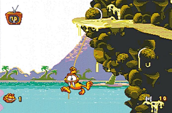 Jim Davis’ gefräßige Zeichentrickkatze unternimmt eine hüpflastige Zeitreise: Die Steinzeit macht Garfield als Säbelzahntiger unsicher, in einer schwarz-weißen Filmkulisse läßt sich der Lasagne-Liebhaber Humphrey-Bogart-Outfit stehen, Ägypten erlebt er als Pharao. Bei einem Trip in die Zukunft unterliegt der Kater der Evolution: Ihr mutiert zum Schlabber-Tier und tappt als Alien durch eine morbide Fels-Landschaft. Anstatt seine Cartoon-Gegner in Grund und Boden zu hopsen, greift Garfield zu zeitgemäßem Prügel- oder Wurfutensil: In der Steinzeit verkloppt Ihr Eure Feinde mit einem Knochen und schmeißt mit Fischgräten um Euch, im Bogart-Streifen knüppelt Ihr mit einer Taschenlampe drauf los. Umsichtige Spieler versorgen ihren Kater regelmäßig mit nahrhaften Hamburgern oder Pizzaecken und nehmen vertrackte Hindernisse dank Steighilfen wie Felskugeln oder Mülltonnen.