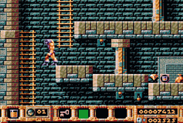 Vier Städte füllten die Götter mit geheimnisvollen Mechanismen, hinterlistigen Fallen und den miesesten Monstern des olympischen Zoos, um Eurem Helden die rechte Herausforderung zu bieten. Mehr als jede x-beliebige Jump’n’Run-Witzfigur hat Euer Muskelprotz jedoch nicht zu bieten. Er kann in zwei Richtungen springen, seine Waffe verschleudern und Leitern erkraxeln. Fliegen die Schüsse mal wieder tief, duckt sich unser Held. Wenn Ihr in dieser Stellung den Feuerknopf drückt, wird nicht gebballert sondern in der Hosentasche gekramt. Dort sammelt Ihr Schlüssel und andere Schmuckstücke. Nur Extrawaffen wandern nicht ins Gepäck, sondern werden sofort aktiviert. Wichtig sind die Schalter, die einzeln aktiviert oder in der Kombination Falltüren öffnen und Steinquader verschieben. Gestört werdet Ihr von fliegenden und watschelnden Wächtern, Dieben und Sturzkampf-Monstern.