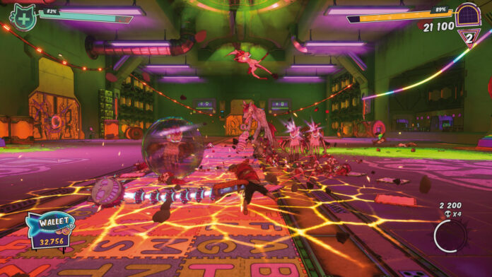 Konsumkritik auf die drastische Art: Eine geldgierige Spielzeugfirma hat mit den ”Ultra Pets” Wesen erfunden, die irgendwie mutiert sind und die Erde in den Untergang stürzten. Nur ein Katzen-Prototyp ist übrig geblieben und will nun seine Erschafferin retten – begleitet von einem sprechenden Hoverboard und einer depressiven KI. Über Sinn und Unsinn der Rahmenhandlung von Gori: Cuddly Carnage nachzudenken, ist vergebene Liebesmüh, befassen wir und also mit dem, was der Name wenig verhohlen andeutet. Hier geht es ausgesprochen rabiat zur Sache, wenn feindliches Spielzeug (meist in diversen Einhorn-Varianten) zerstückelt wird und roter Lebenssaft in Hektolitern über den Bildschirm spritzt. Als reine Gewaltorgie ist das wilde Treiben aber nicht gedacht, denn zwischen den Metzeleien warten stets Passagen nach typischer 3D-Hüpfer-Art, die Ihr auf dem Hoverboard gleitend absolviert. Die Mischung geht solide auf, zumal die Grafik (zumindest im Performance-Modus) flüssig bleibt und die Szenarien mit schrillen Neonfarben und wilden Kulissen genug Abwechslung und Schauwert bieten.