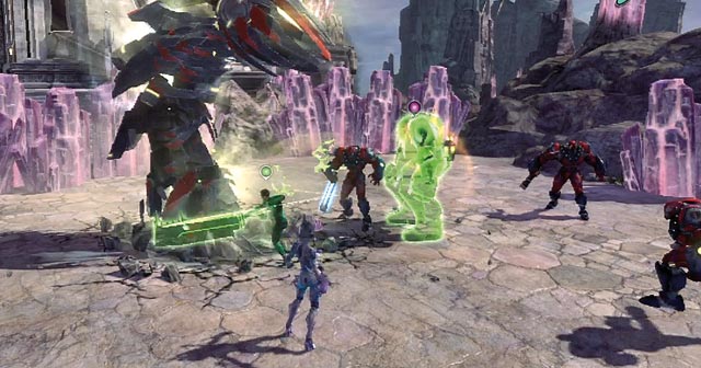 In der aktuellen DC-Comic-Verfilmung Green Lantern wird Testpilot Hal Jordan ungewollt zum interstellaren Superhelden seine Kraft verleiht ihm ein mächtiger Ring. Während der Kinofilm zur grünen Laterne Jordans Geschichte von Beginn an erzählt, fängt das Spiel so ansatzlos an, dass Ihr zunächst glaubt, das Intro abgebrochen zu haben. Ihr seht Euch sofort einer Invasion der Manhunter-Roboter gegenüber die gilt es zurückzuschlagen. Euer Ring kann im Kampf verschiedenste Formen annehmen, alle darauf ausgelegt, den Gegnern die Blechnasen einzuschlagen. Abseits von Standardangriffen verwandelt sich der Ring in Gebilde wie Baseballschläger, Mech-Rüstung oder Kampfjet. Der Einsatz dieser Gebilde verbraucht grüne Energie, die aus getöteten Feinden oder herumstehenden Behältern gespeist wird.