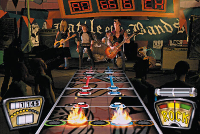 Für alle, die den ersten Guitar Hero-Teil noch nicht kennen: Auf der Plas­tikgitarre befinden sich fünf bunte Knöpfe, ein Wippschalter sowie ein Vibrato-Hebel. In Eurem lässigen Controller versteckt sich zudem ein Sensor, der das Hochreißen der Klampfe erkennt und zum Aktivieren der Star Power (verdoppelt die Punktzahl und füllt das Rock Meter) dient. Mit diesen ‘Werkzeugen’ drückt Ihr auf dem Bildschirm erscheinende Symbole möglichst im vorgegebenen Takt nach. Für jede erfolgreich nachgespielte Note (eine Taste) oder Akkord (bis zu drei Tasten gleichzeitig) erntet Ihr Punkte, das Rock Meter bewegt sich gen grünen Bereich und wohlklingende Töne dringen aus den ­Boxen. Vergeigte Noten dagegen werden mit einem hässlichen ‘Plock’ und dem kurzen Erbeben des Bildschirms quittiert, außerdem sinkt ­Euer Ansehen beim Publikum. Wer zu oft daneben haut, erntet Pfiffe und riskiert den Abbruch des Gigs. Die Entwickler achteten natürlich erneut auf die Feinheiten des echten Gitarrenspiels: Die ehemals diffizil auszuführenden Hammer-Ons und Pull-Offs gehen in Teil 2 deutlich leichter von der Hand. Außerdem hielten ­Power-Chords mit drei statt nur zwei Noten Einzug.
