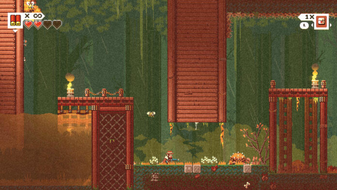 Eben dieser Gunbrella – einerseits durchschlagskräftige Flinte, andererseits Regenschirm – befindet sich nun im Besitz eines grummeligen Holzfällers, der auf Rache sinnt, wurde doch seine Gattin vom mysteriösen vorherigen Eigentümer damit gemeuchelt. Um der Sache auf den Grund zu gehen, erkundet Ihr eine 2D-Pixel-Welt, die mit primär braunen Farbtönen und (optional abschaltbarem) Grießelfilter eine grimmige Steampunk-Atmo­sphäre vermittelt. Das hört sich nach einem Metroidvania an, ist aber in weiten Teilen eine ziemlich schnörkellose Interpretation des Konzepts: Erkundung spielt eine eher zweitrangige Rolle und die Wege sind direkt (zum Glück, da auf eine Karte verzichtet ­wurde), auch Upgrades beschränken sich auf ein Minimum. Star des Abenteuers ist natürlich der ­Gunbrella, der neben seiner Feuerkraft als praktisches Multifunktionswerkzeug dient: Spannt Ihr ihn per Knopfdruck auf, könnt Ihr je nach Situation einen flotten Dash hinlegen, Projektile abwehren oder sogar reflektieren, höher springen, unter Wasser schneller tauchen oder an Seilen gleiten – alles ­Dinge, die Ihr auf Eurer Mission prima gebrauchen könnt.