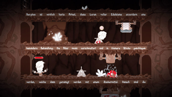 Lodert ein Feuer vor dem Exit? Dann gibt es irgendwo bestimmt die Wörter ”Eimer” und ”Wasser”. Steht Haimrik auf diesen Worten, kann er die Dinge erscheinen lassen und damit die Flammen löschen. Ist Euch ein Vampir auf den Fersen? Dann gibt es vielleicht irgendwo die Worte ”Sonnenschein” oder ”Tag”, die den Blutsauger zu Staub werden lassen. Zu Beginn sind die Rätsel sehr simpel, sobald aber Verben, mehrere parallele Sätze und permanent attackierende Feinde dazukommen, steigt die Herausforderung – dann müsst Ihr Begriffe kombinieren, in der richtigen Reihenfolge aktivieren und um die Ecke denken. Ein Manko sind die simplen Kämpfe, bei denen Ihr durch manche Eingabeverzögerung ins Gras beißt. Der schwarz-weiß dominierte Zeichenstil wird durch roten Lebenssaft aufgelockert. Haimrik und seine Gegner sterben auf Mortal Kombat-würdige Weisen und garantieren damit den ein oder anderen Lacher für Freunde des schwarzen Humors. Den Ton solltet Ihr abschalten, die Musik nervt durch ständige Wiederholungen.