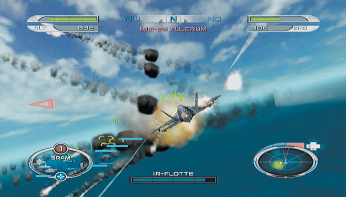 Nach wenigen Spielminuten steht bereits fest: Heatseeker verschwendet keine Zeit. Schon im Tutorial sitzt Ihr im Cockpit eines potenten Kampfjets und braust in Richtung eines karibischen Eilands. Habt Ihr zuvor die Steuerungsvariante ’Arcade’ gewählt, ist die weitere Handhabung kein Problem: Mit den Analogknüppeln der PS2 bestimmt Ihr die Richtung und zündet den Nachbrenner, auf dem Wii lasst Ihr die Maschine durch Neigen der Fernbedienung steigen, sinken und zur Seite rollen. Jeglichen Simulationsanspruch wirft Codemasters gleich in den ersten Minuten über Bord, stattdessen zeigt sich Heatseeker von seiner actionreichen Seite: In wilden Flugmanövern jagt Ihr feindlichen Kampfjets hinterher, versenkt Schiffe sowie U-Boote und bombardiert Flak-Geschütze auf kleinen Inseln. Besonders spektakuläre Abschüsse fängt die ’Impact Cam’ ein und zeigt im Detail das zerberstende Feindflugzeug. Wer’s noch voyeuristischer mag, hält die Feuertaste gedrückt und folgt der abgeschossenen Rakete bis zum Ziel. Apropos Ziel: Die Kamera zeigt Euch den Gegner entweder aus einer Ego- oder zwei Third-Person-Perspektiven. Zusätzlich könnt Ihr die aus Heroes of the Pacific und Blazing Angels bekannte Zielsicht nutzen, um den anvisierten Feind im Auge zu behalten. Ein genauerer Blick lohnt sich jedoch selten, vor allem die verwaschenen Bodentexturen der Inseln und die kantigen Schiffsmodelle sind nicht allzu hübsch geraten. Der Fokus liegt eindeutig auf den flotten Luftkämpfen und schicken Explosionen. Entsprechend gut gerüstet startet Ihr in die Missionen: Ausgehend vom erwarteten Widerstand rüstet Ihr das Fluggefährt Eurer Wahl mit Luft-Luft-Raketen, Mehrzweckgeschossen oder Bodenprojektilen aus. Sogar eine Atombombe befindet sich im Repertoire. Reicht das nicht aus, ruft Ihr Euren Flügelmann zur Unterstützung. Via Steuerkreuz weist Ihr den Rottenflieger an, Verbündete zu beschützen, Euch zu folgen oder ein anvisiertes Ziel anzugreifen.