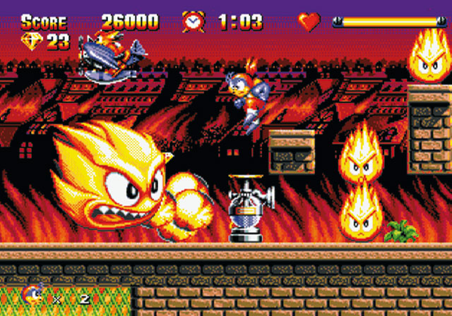 Schließlich habt Ihr kein simples Zeitlimit im Rücken, sondern eine Riesen-Flamme verfolgt den eilig hüpfenden Havoc. Damit er sich an den Hindernissen nicht die Finger verbrennt, stehen an ausgesuchten Stellen Hydranten bereit: Springt Havoc auf die Wasser-Spender, zwängt sich ein Wassertropfen aus der Öffnung und eliminiert die lodernde Flamme. Manchmal reichen Joypad-Künste alleine nicht aus, das rettende Ufer zu erreichen. Kleine Denkaufgaben lockern das Spielgeschehen auf. Ein Paßwort sucht Ihr vergebens, sodaß Ihr die unlimitierten Continues durchaus zu schätzen wißt.