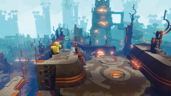 Zwar laufen auch ein paar Gegner herum, die Ihr mit schnellen Angriffen und noch schnelleren Ausweichrollen verprügeln könnt. Als Belohnung gibt es grüne Kugeln, die Ihr in neue Manöver investiert. Im Fokus stehen aber weniger die Kämpfe als die Rätsel. Die erstrecken sich über die ganze Spielfläche: Die Welt von Hob erinnert oft eher ein eine große, clever verzahnte Maschine. Mal teleportiert Ihr Euch über gähnende Abgründe, mal schlagt Ihr spröde Mauern ein, mal aktiviert Ihr mysteriöse Maschinen und nicht selten bewegt Ihr große Teile der Umgebung, um voranzukommen. Die nahtlose Implementierung der flexiblen Welt ist dabei beeindruckend.