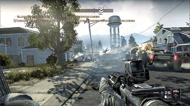 Die Kampagne ist nur ein Snack für zwischendurch, was hebt Homefront also aus der Masse der Ego-Shooter heraus? Die Antwort findet sich im Mehrspieler-Modus, welchen die Entwickler von Frontlines: Fuel of War mit einigen abwechslungsreichen Extras ausgestattet haben. Anfangs spielen sich die Multiplayer-Partien auf den sieben bzw. acht Karten mit bis zu 32 Recken wie ein etwas langsameres Pendant zum Activision-Primus. Doch sobald Ihr erste Abschüsse verzeichnet und Stellungen einnehmt, regnet es Kampfpunkte, die Ihr in Fahrzeuge und Extras investiert. So kauft Ihr während des Gefechts fahrende und fliegende Drohnen, eine Splitterweste oder Luftschläge. Ab Stufe 7 dürft Ihr an den Battle Commander-Modi teilnehmen, die den Gefechten zusätzliche Würze in Form eines KI-gesteuerten Belohnungssystems verleihen. Für Abschuss-Serien zeichnet Euch das System mit Sternen und Mini-Aufträgen aus, für die es zusätzliche Kampfpunkte gibt. Der Clou: Je mehr Sterne ein Spieler hat, desto mehr Kontrahenten setzt der Battle Commander speziell auf ihn an. Diese Jäger sehen auf ihrer Minikarte grob, wo sich der Gejagte aufhält, und bekommen für sein Ableben natürlich einen Batzen Punkte. Zusammen mit der großen Auswahl an Ausrüstung, Fahrzeugen und Drohnen entwickeln sich so sehr dynamische Schlachten, die in Sachen Geschwindigkeit und Taktik zwischen Bad Company 2 und Black Ops angesiedelt sind.