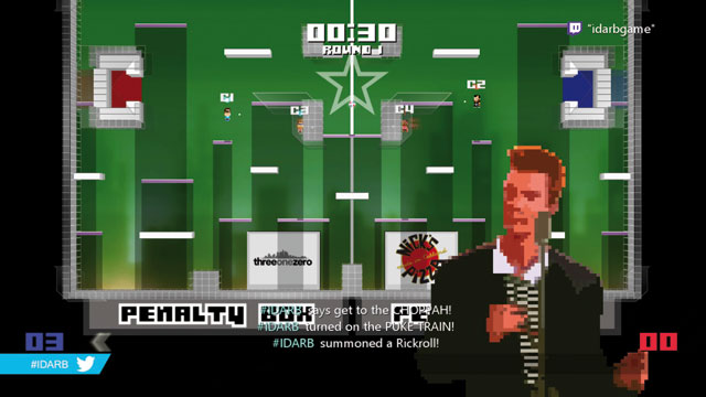 Der schräge Name (ein Kürzel des Prototypen-Titels It draws a red box ist Programm: Was Other Ocean da unter Berücksichtigung zahlreicher Community-Vorschläge zusammengebastelt hat, entpuppt sich als reizvoll-wirrer Geschicklichkeitssport im Retro-Look, der entfernt an Handball erinnert. Ziel ist es, einen Ball ins gegnerische Tor zu bugsieren. Doch ein Spielfeld voller Plattformen, hektisches Tempo und die (auf Wunsch abschaltbaren) Hashbombs, bei denen automatisch oder per Chat-Einbindung von Zusehern zahllose visuelle oder spielerische Modifikatoren einwirken, sorgen für Chaos. Alleine macht das nicht lange Laune, mit Freunden und am besten mit ein paar Bier kann dagegen durchaus Stimmung aufkommen dumm nur, dass die Mehrspieler-Optionen gerade beim Online-Matchmaking noch lange nicht ausgereift sind.
