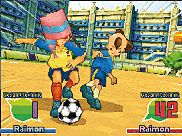 Ihr schlüpft in die Rolle des Torwarts Mark Evans, Kapitän der maroden Schulmannschaft der Raimon Jr. High. Eure Aufgabe: Macht aus der Hobby-Elf ein starkes Team und gewinnt das Final-Frontier-Turnier. Natürlich erwartet Euch kein trockener Fußball-Manager, das Rollenspiel hüllt den Ballsport in eine klischeebeladene Manga-Geschichte, komplett mit großen Kulleraugen, kindlichen Dialogen und den klassischen Anime-Stereotypen. Ihr bewegt Euch in bester Final Fantasy-Tradition durch verschiedene Gebiete, spielt in recht eintönigen Zufallsbegegnungen zu viert gegen andere Schüler, rekrutiert Unmengen neuer Spielkameraden und levelt Eure Athleten auf. Die Turnierspiele bestreitet Ihr mit elf Spielern und nach echten Fußballregeln inklusive Fouls und Abseits gegen fantasievolle Mannschaften wie etwa die magiebegabte Occult Jr. High. Ihr zeichnet in Echtzeit oder im Pause-Modus Laufwege und wählt aus Tacklings, Grätschen, Hebern und Paraden. Spezialtechniken ersetzen die Zaubersprüche klassischer Rollenspiele: Mit ’Superblitz‘ oder ’Wildnis-Kralle‘ überwindet Ihr in Minisequenzen die gegnerische Verteidigung oder pariert Schüsse. Online ladet Ihr weitere Athleten herunter, was angesichts der etwa 1.000 Spieler aus der Einzelspieler-Kampagne unnötig anmutet.