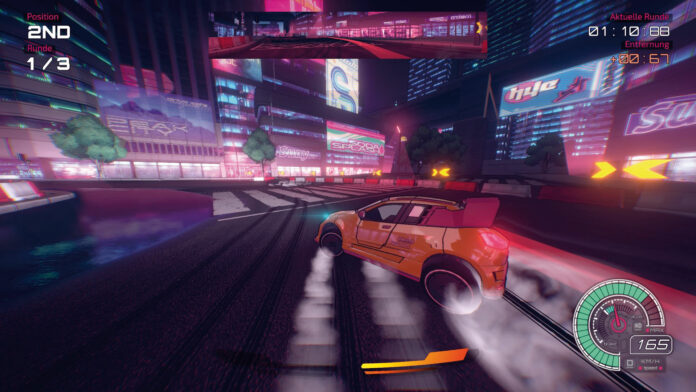 Das mag sich im ersten Moment merkwürdig anhören, entpuppt sich aber als gelungener Kniff und gibt im Zusammenspiel mit Tempodosierung bei besonders engen Kurven erstaunlich feinfühlige Kontrolle über die Schlitterei. Die braucht Ihr auch, um in diversen Wettkampftypen von Zeitjagd über Stilwettbewerb bis zu Rennduellen (bei denen es keine Kollisionen gibt) zu bestehen und weitere Vehikel freizuschalten. Wer sich da zu sehr von der stilvollen Präsentation mit Synthwave-inspirierter Optik und flotter Jazz- und Lounge-Musik ablenken lässt, wird zum Gespött der Drift-Szene.